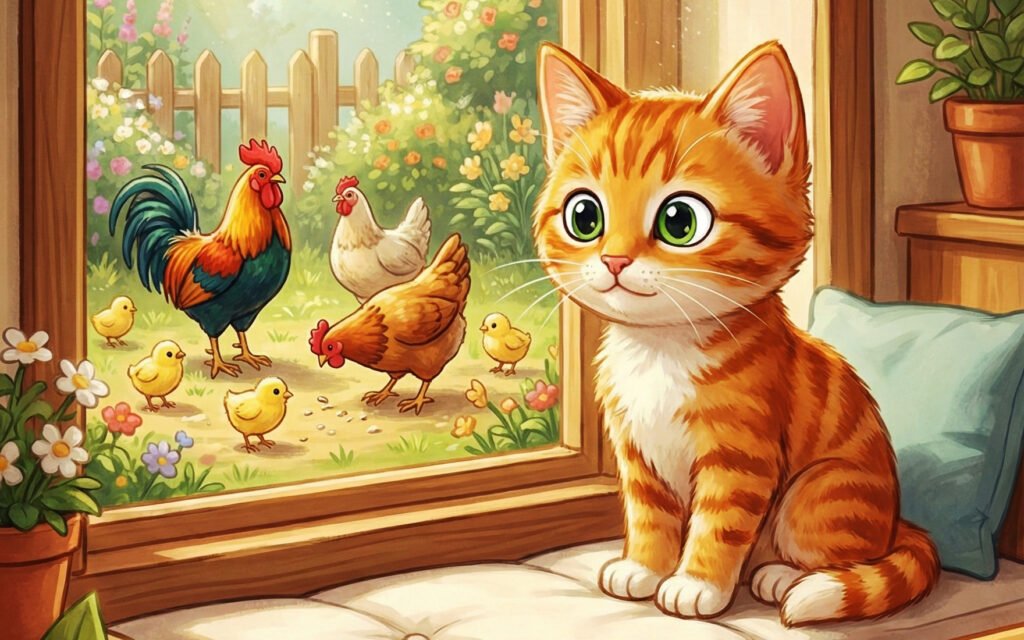 Tabby Leona spent her earliest days watching the chickens play outside from the farmhouse window, waiting patiently until she was old enough to join them. When she was finally allowed into the yard, she played with excitement and curiosity, eager to belong. One playful moment went wrong, and although no one was hurt, the scare was enough to change everything. Acting out of care and responsibility, Farmer William forbade Leona from going near the chicken coop again.