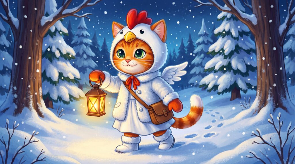 She’s a playful cat dressed up like a chicken in order to be closer to her farmyard friends while learning and teaching important life lessons through her daily activities.